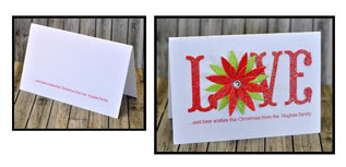 At this point I turned to my PC and typed the phrase '....and best wishes this Christmas from the Hughes Family' before printing it in red onto a 16 x 22cm sheet of quality heavyweight white card (I always use Inspire Me Papers) The phrase measures 13cm the same as the word 'LOVE'. Once the base card was folded I carefully attached the word/poinsettia one at a time.