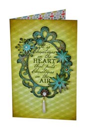 This card features both the flowers and snowflakes without the stamps, The frame is Frame, Scrollwork from the new Indie Craft Festival Range. I die cut the frame,flowers and snowflakes from a patterned blue/green card and set about adding colour using some of my favourite distress ink before attaching all the elements together and decorating with adhesive pearl accents in the centre of the flowers/snowflakes and adding a jewelled accent to the bottom of the frame. I measured the centre of the frame and used my PC to create the phrase before printing onto the green patterned card. Finally, I mounted the frame onto teh base card using 3D foam pads.