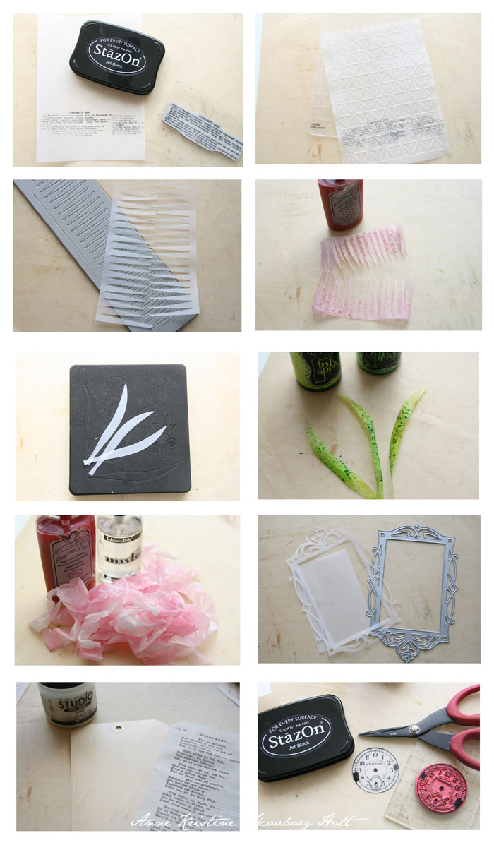Stemple bakgrunnstekst på vellum. Emboss Vellum med Embossing folder Sizzix Textured Impressions Embossing Folders 4PK - Jar Labels Set