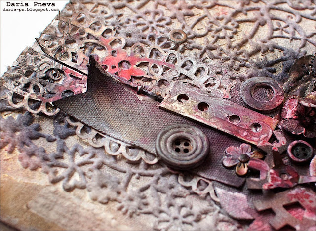 Today I would like to share a mixed-media cover for my new album. I started create album about me and I needed a cover. I used different cute things that I found at home (such as washers, bottle caps, parts of old clocks and etc.) and of course different dies.
