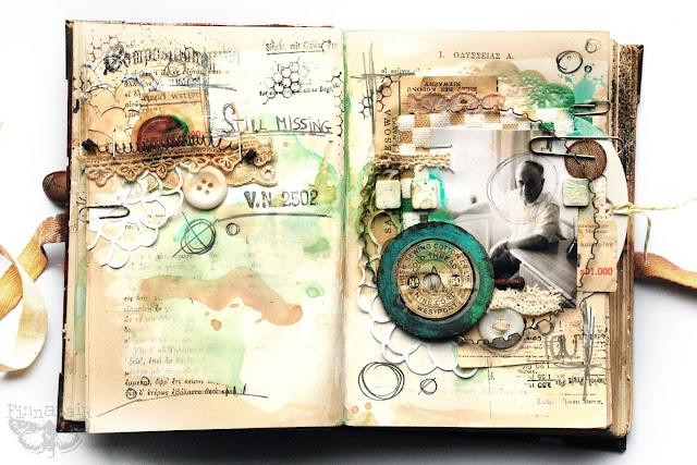 Again- all the colours come from homemade tea stain, Vintaj Patina and sprays (Luminarte Primary Elements with water), there is a bit of gesso and some 3D Foams by Scrapbook Adhesives used as embellishments too ;) As finishing touches I used some metal elements such as paper clips, an iron plate I found on the street, piece of wire I got from one of my students, buttons and staples. The checked fabric is one of the Canvas Resist Sheets (my Elementals by Prima) and stamps are a choice of background patterns from my Prima Vintage Vanity collection.