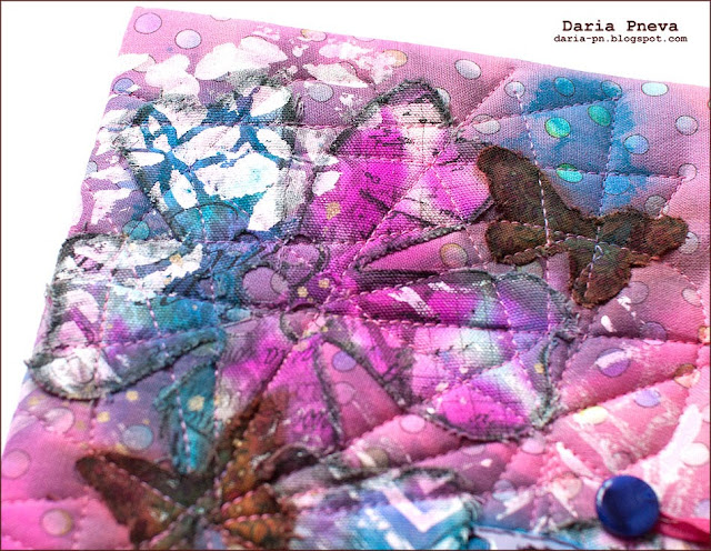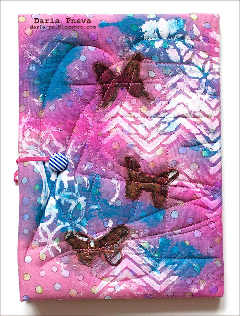 I made the inner sheets from watercolor papers. Сover I made using cotton fabric. To add different shapes on the cover, I cut these shapes using dies (also from cotton fabric). I sewed them onto the cover using a sewing machine. Then I used white acrylic paint and different sprays with stencils. After paint dried, I outline the edges of the shapes using PITT Artist Pens.