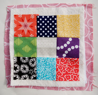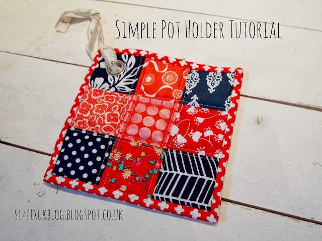 I used the 2.5" square die to make simple 9 patch blocks from scraps. I then used my scissors to cut out squares a little larger than the patchwork block from cotton wadding, an insulating wadding such as bosal poly-therm fleece (you need both a cotton wadding and an insulating wadding to make sure you don't burn your hands), and backing fabric.