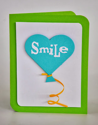 Next I would cut a thin strip of yellow card and curl it around a pencil or paintbrush before attaching to the end of the balloon. Next I would measure the base card and its white background before rounding off some or all of the corners with a corner punch.
