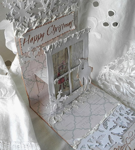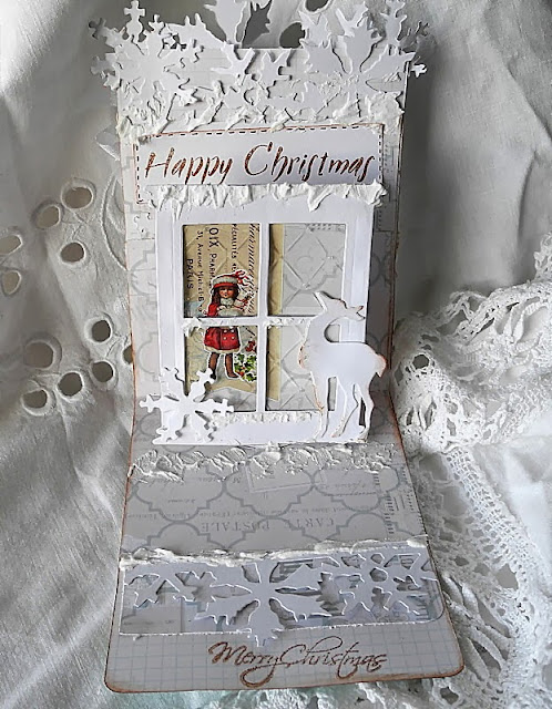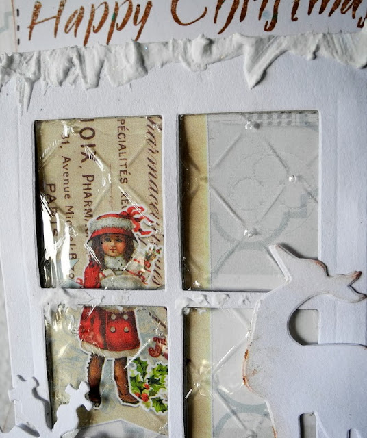 Die cut The Sizzix Bigz Die - Window & Window Box in recycled cardstock and White cardstock glue together, glue gelatine to the die cut window , it is the glass, glue the cut out image to the window