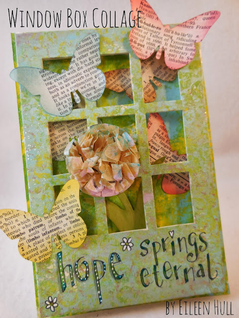Before cutting the die, I trimmed the matboard to make a foldover panel. to I used my Gelli Plate to build up layers of color on the matboard frame. After the paint dried, I lettered "Hope springs eternal" at the bottom of the frame and filled it in with Copic markers and white pen. I love how the white pen peps up the letters and create dimension and pop.