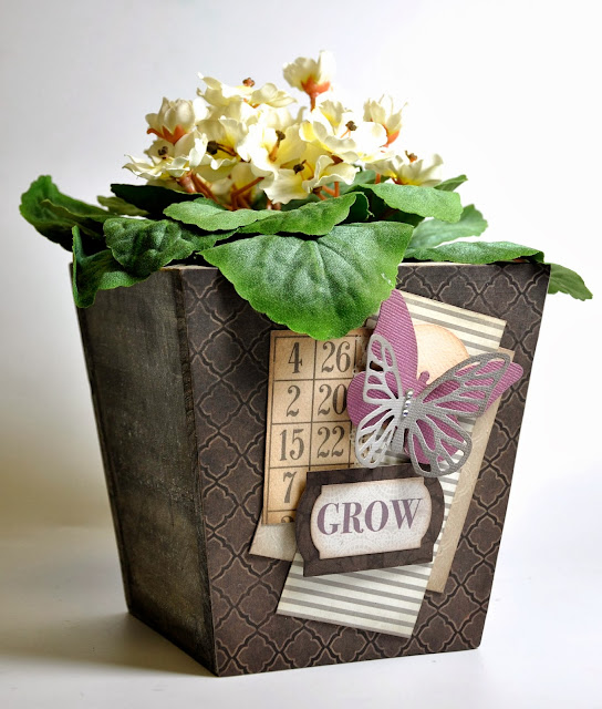 You can create this effect with any straight sided wooden plant pot, simply use the side of the pot as your template and draw around this onto patterned paper before cutting out, inking and sticking into position with double-sided tape. There is no real rhyme or reason to what has been attached in all honesty, I simply cut some scraps of paper into rectangles and played around with their positioning until they looked right! Text was created using a PC and printer and then cut out with the Framelit label in the kit. The delicate butterfly was offset slightly and decorated with tiny pearl gems.