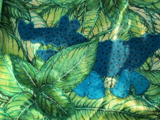 Originally I was going to make the leaves, that hide parts of the animals, into flaps that could be lifted to reveal the whole creature - but then thought that the amount of play this will get it might be better to just fix the leaves in place. I stitched all the animals in place, then fused the leaves in place. I layered the backing and wadding with the front and the zig-zag quilted around the leaves - a fast and I think effective method of completing the quilt.