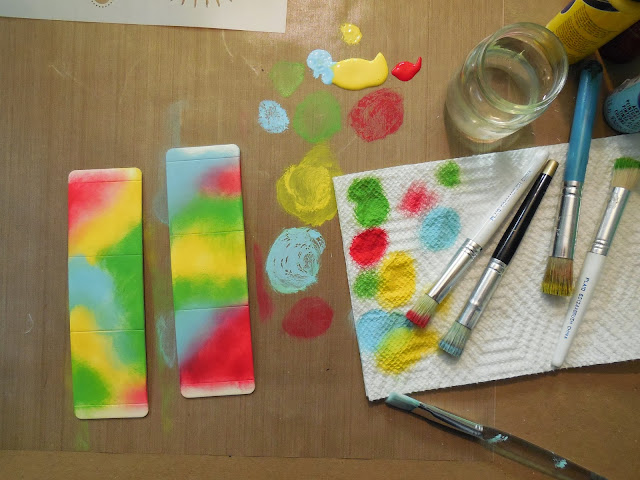 Paint the blocks with regular acrylic paint using a stencil brush, then blended the colors together, adding layer on top of layer. Start with light layers- you can always get darker.