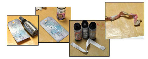 Spray the tag with a metallic Perfect Pearls mist of your choice and apply the crackle accents over the number 3 Take a length of crinkle ribbon and colour with Distress stains before scrunching and drying with a heat tool.