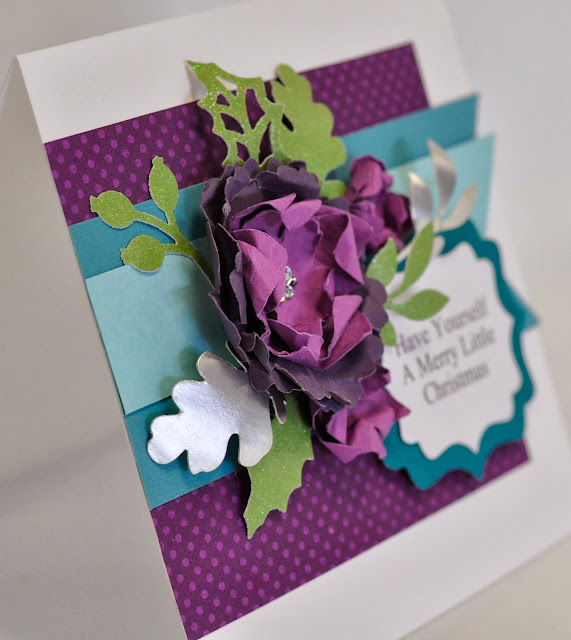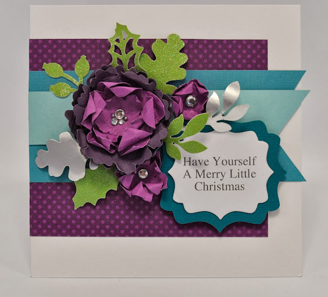 I decided to add a little texture to the card by crumpling the die-cut flower shapes in my hand before layering. I love the effect, especially when compared to the glossy sheen of the metallic silver card elements. The green glitter card also gives a subtle festive hint without being too obvious.