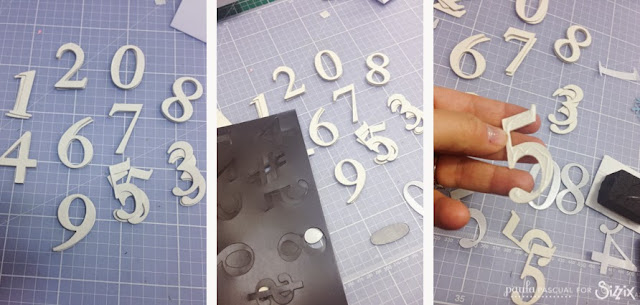 I glue all three die cuts of the same number together and peel off the back and attached to the mount board numbers.