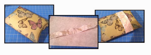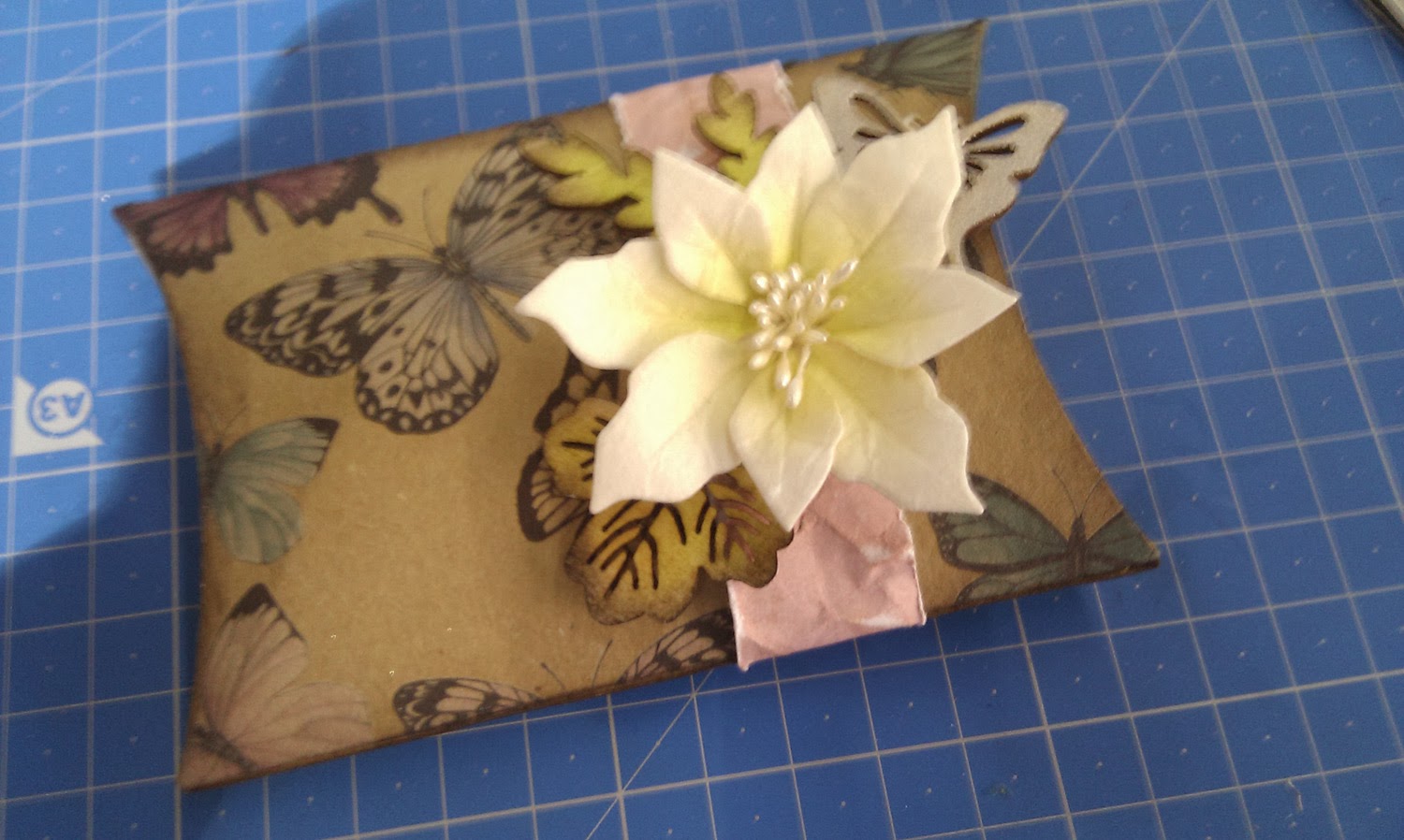 I die cut a pillow box from printed Kraft card (Craft Emotions again!) and cut a strip of pink paper which I scrunched and distressed with inks before lightly sanding. I then wrapped the strip around the box,