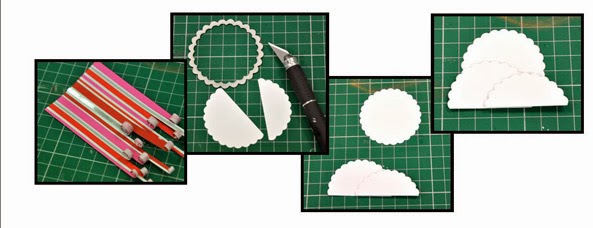 I cut a thin strip of silver mirror card and attached it down the centre for reasons which will become apparent at the end! Next I die cut two scalloped circles (the die is about 5cm wide) one of which I cut in two before attaching them together using 3D foam pads and I attached the third at the rear again using the foam pads to add dimension.