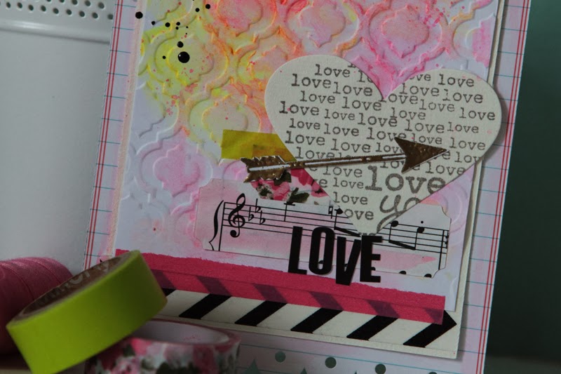 Assemblez l'ensemble en ajoutant quelques touches de masking tape assortis. Eclaboussez d'encre de chine noire, ajoutez le titre LOVE à l'aide d'alphabets et votre carte de St Valentin est prête !