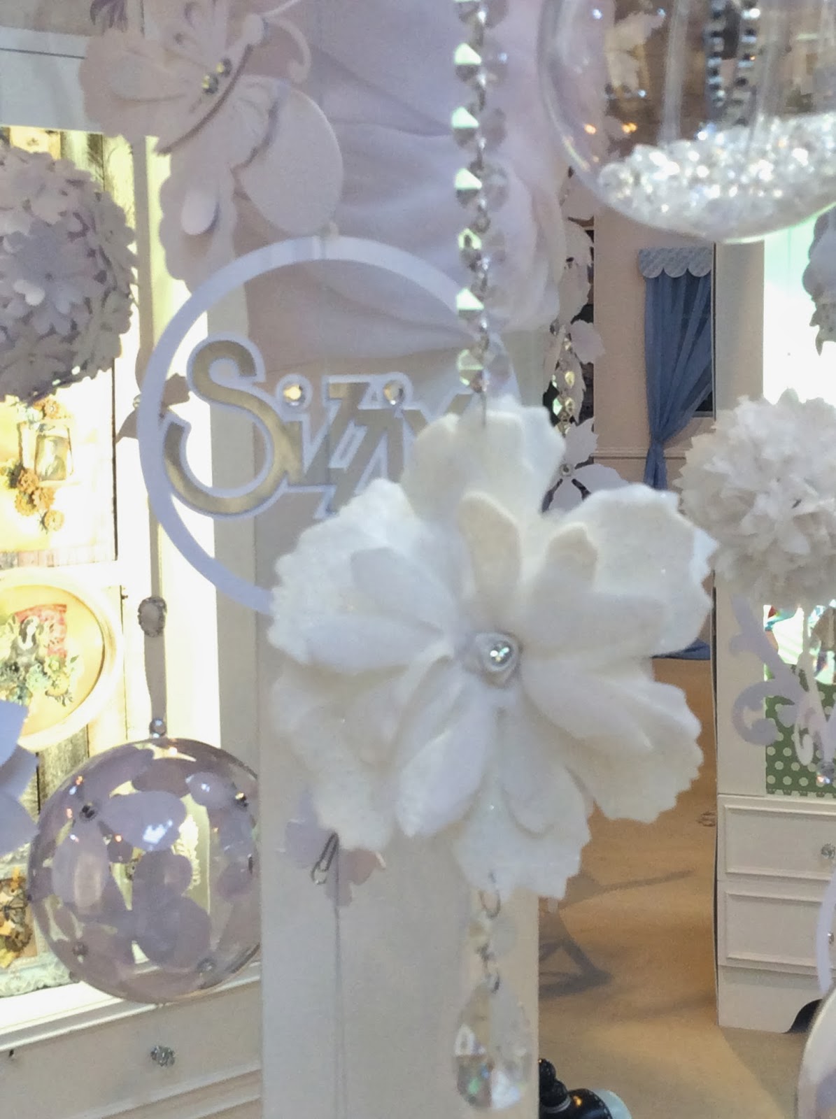 It is a little difficult to see but this large hanging flower is made from White glittery felt and voile and is cut using the new Jumbo Tattered Flower die from Tim Holtz which goes to show that you don't have to like grunge to use a Tim Holtz die! The Tattered Floral dies have been so popular and I absolutely love that we now have a jumbo version.