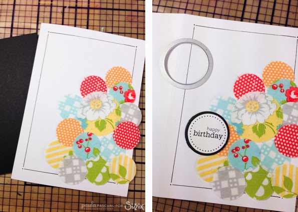 I die cut the circles using the large and small circle dies on the Bigz die. I then layered them on white card and sew them on the machine making inverted L shapes.