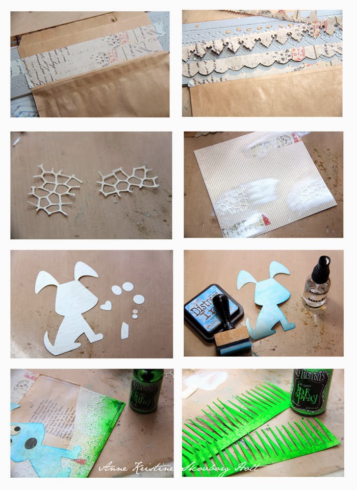 Skjær et panel i mønsterark, bruk det du har til overs fra borden og lim dette til panel med Gesso. Lim Tissue tape og gammel bokside til panel med Glue N'seal.Stans ut hunden i mønsterark med Sizzix Bigz Die - Dog, Puppy