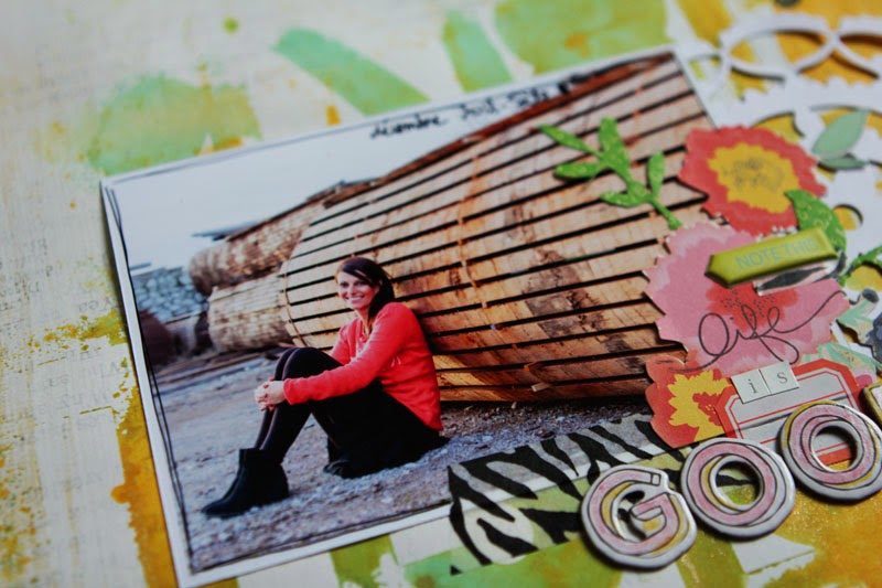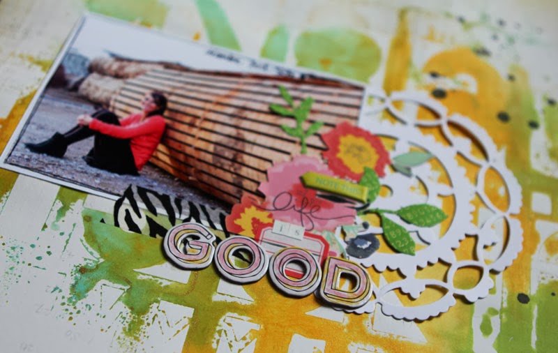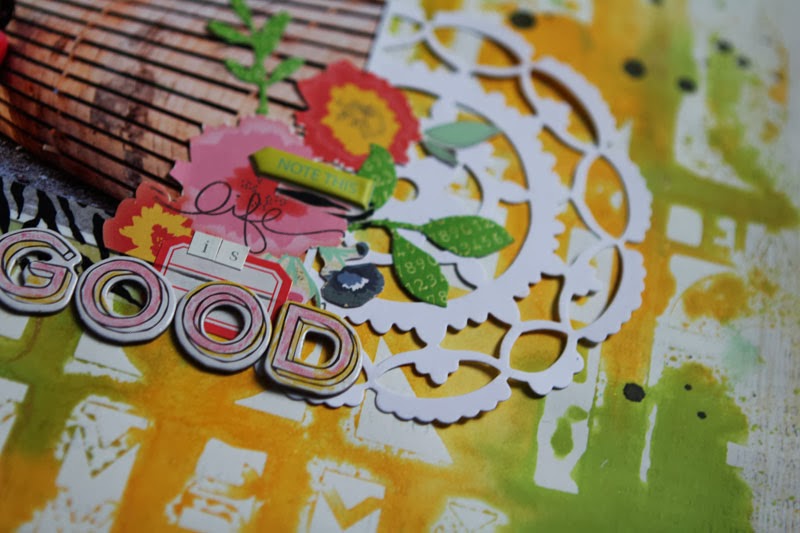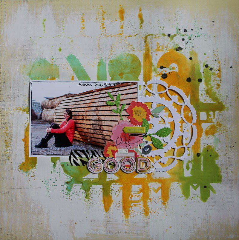 J'ai commencé par retravailler mon fond de page à l'aide d'un pochoir 12x12 et de deux couleurs d'encres en spray ( vert et jaune).