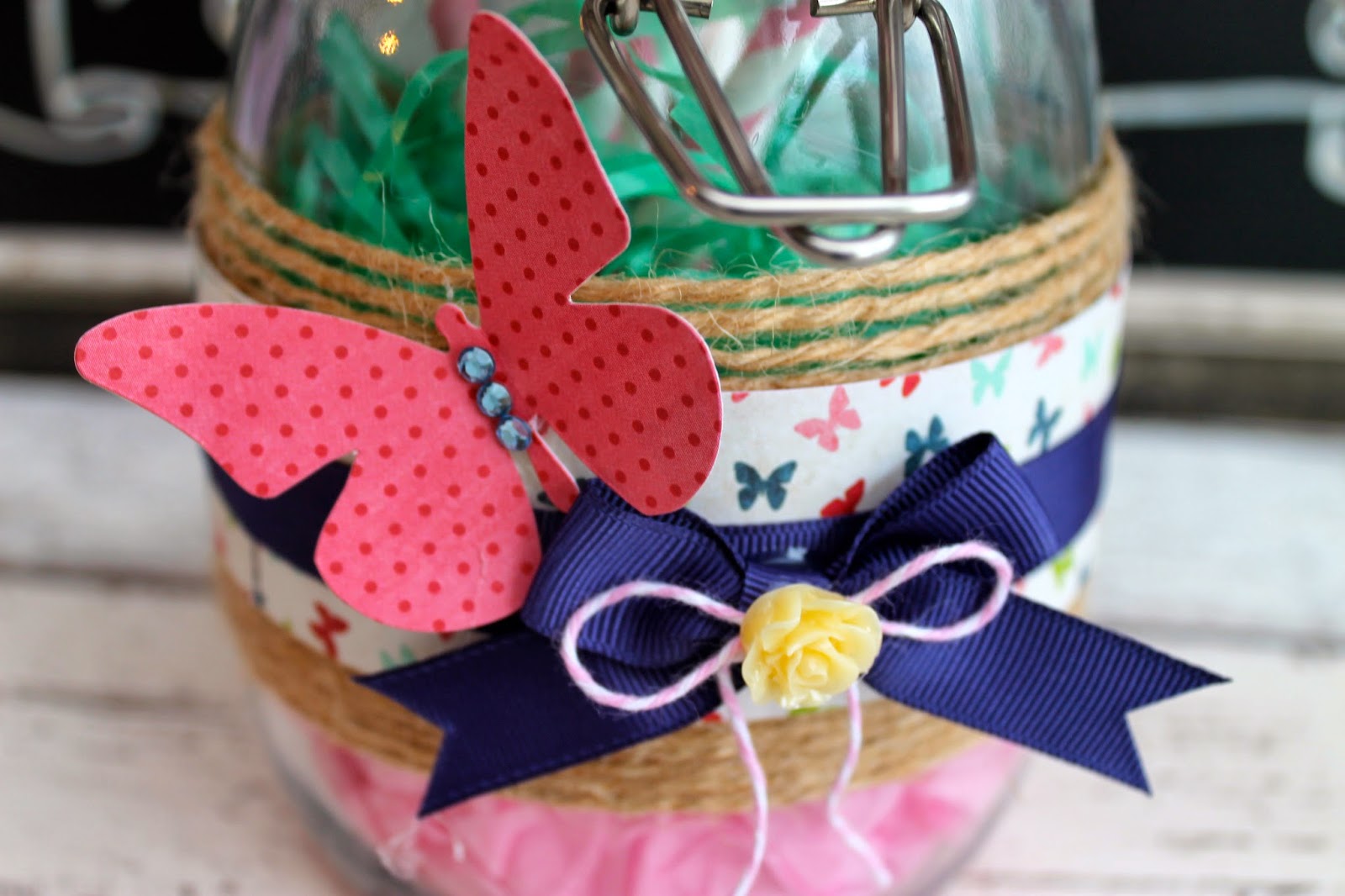 I have then taken a kilner jar and decorated it using string and papers along with the Butterfly die from the Sizzix Starter Kit.
