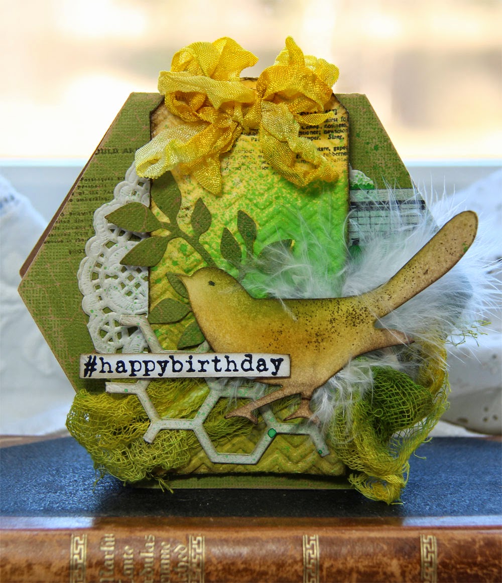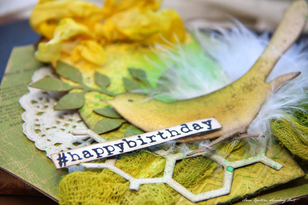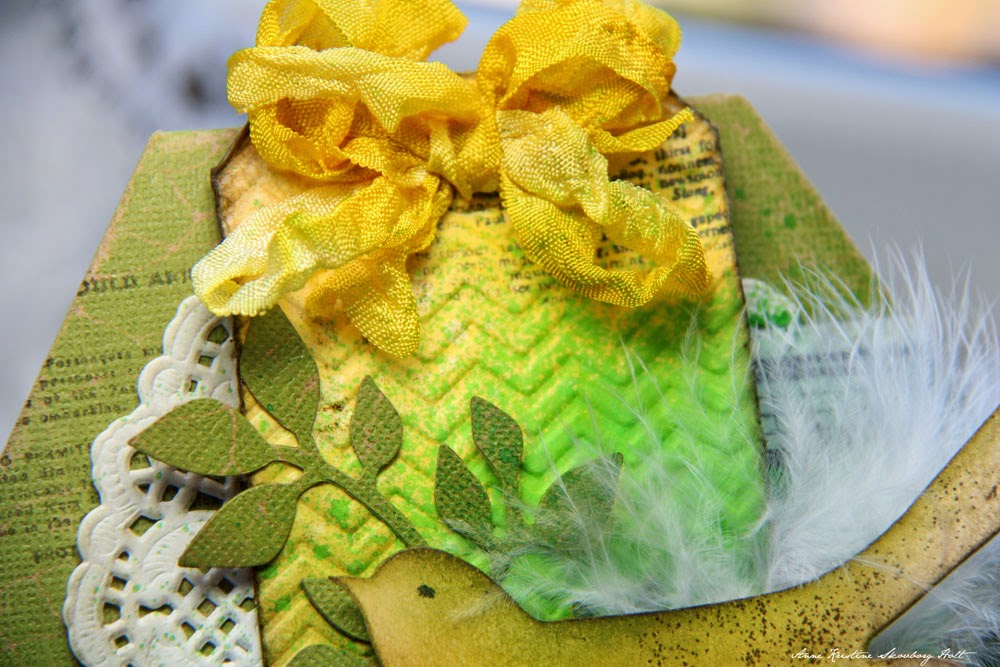 Glue the tag over Paper Doilies with 3D foam. Glue greenery, framework and cheesecloth (color cheesecloth with Distress ink Pad and water) in the front. Spray Dylusions Ink Spray - Cut Grass over the card before you glue the bird with a feather in front.