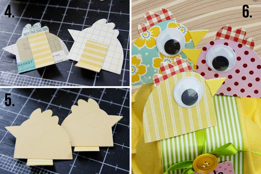 6. Next up I decorated the birds with googly eyes, beaks and combs. Once that was done I attached the birds to the egg carton using glue dots.