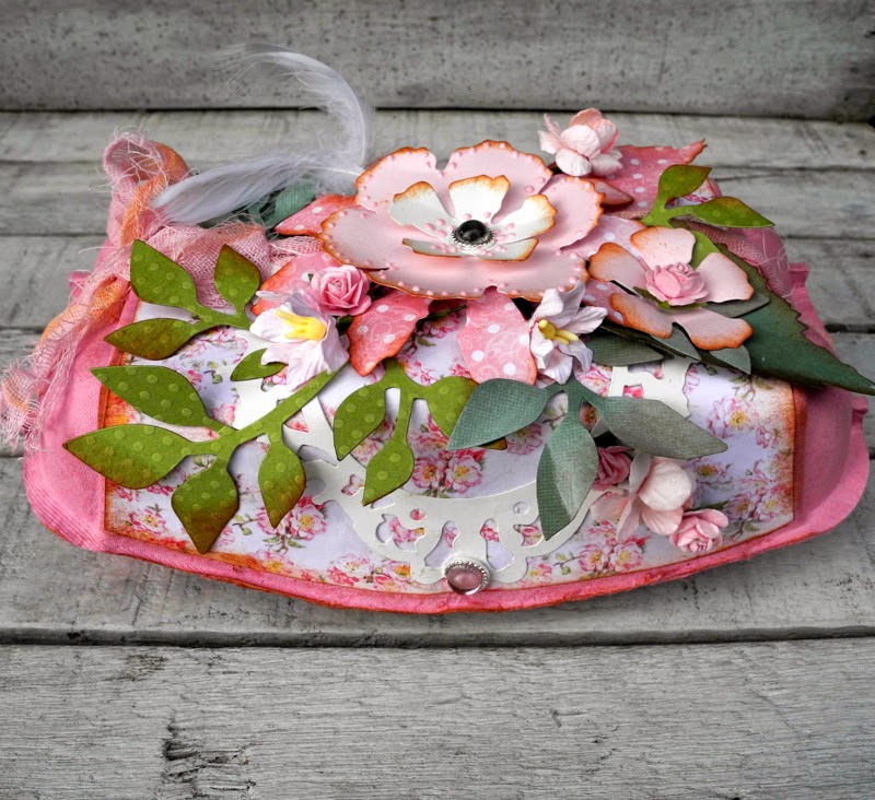 Udstans Jumbo tattered florals og garden greens. Dekorer boxen med blomster de udstansede figurer , fjer , til sidst har jeg pyntet de udstansede blomster med pontura paint