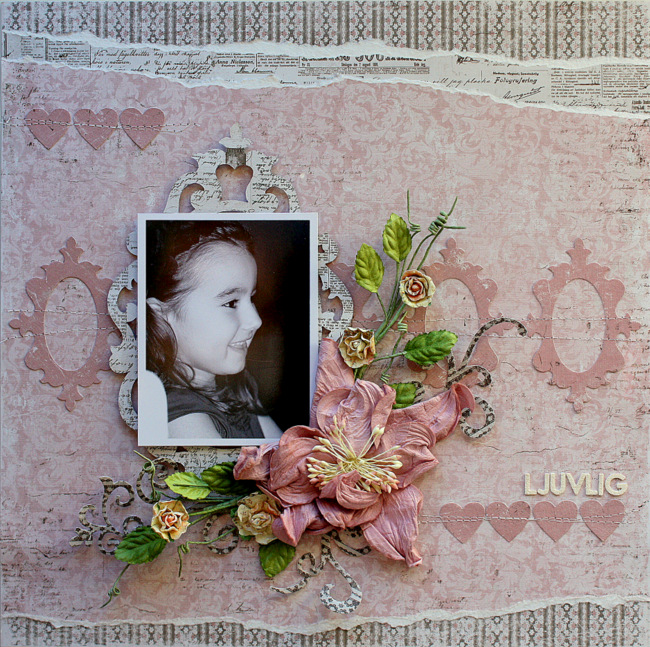 Jag använde dies från die-set 657902 som du kan se ovan. Jag skar ut en stor ram och fem av den mindre ramen. Jag använde också sju hjärtan. Sen limmade jag på de små ramarna och hjärtana på sidan. För att lägga till lite mer dimension och detaljer till bakgrunden så använde jag min symaskin för att lägga till stygn. Den större ramen blev till fotomatta och lyfter fotot från bakgrunden. Sen dekorerade jag layouten med lite blommor och några Sizzix flourishes.