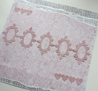 I cut out one large frame and five of the smaller frames. I also used seven hearts. Then I glued them like this.
