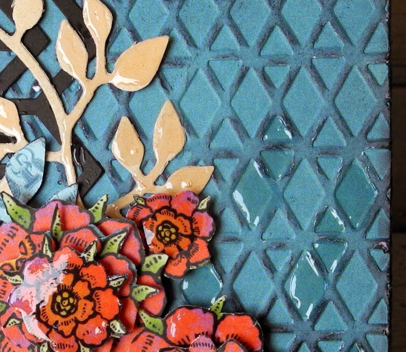 Ribbon-Cheese cloth paint with distress ink, flowers cut out of a patterned paper, Glossy accent used on flowers and leaves