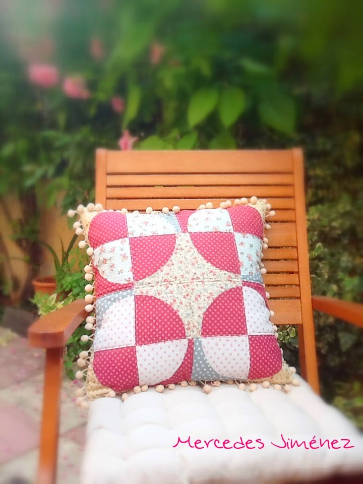 Para la parte de atrás del cojín cosí dos bloques más y añadí en un extremo un rectángulo de otra tela, Aquí es donde luego cosí los botones.
