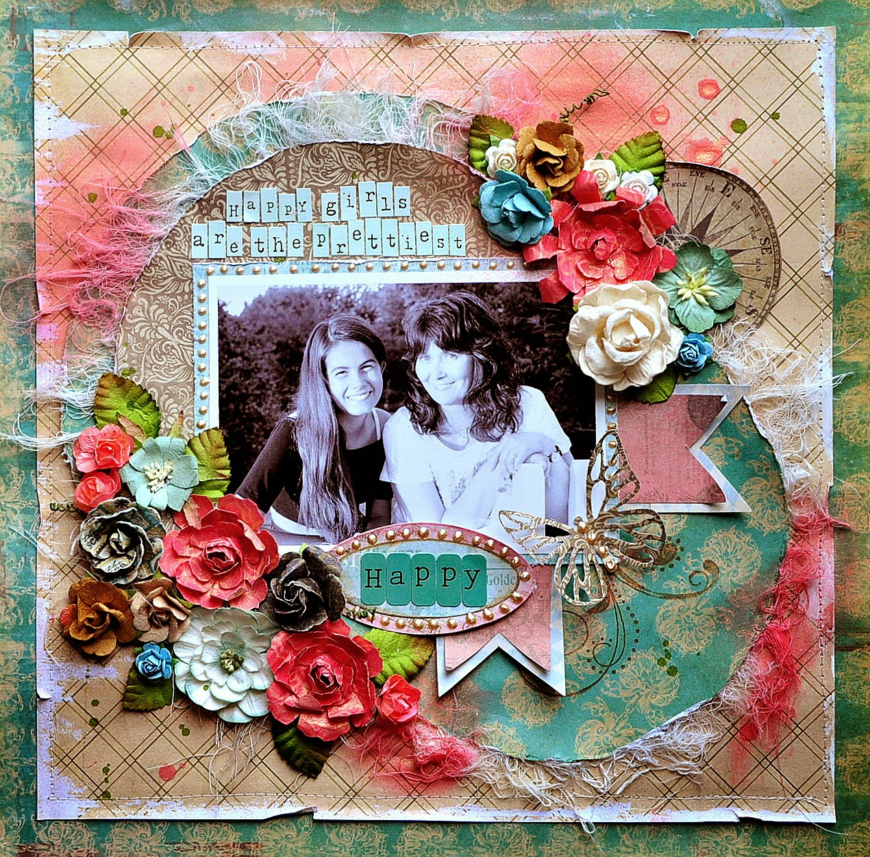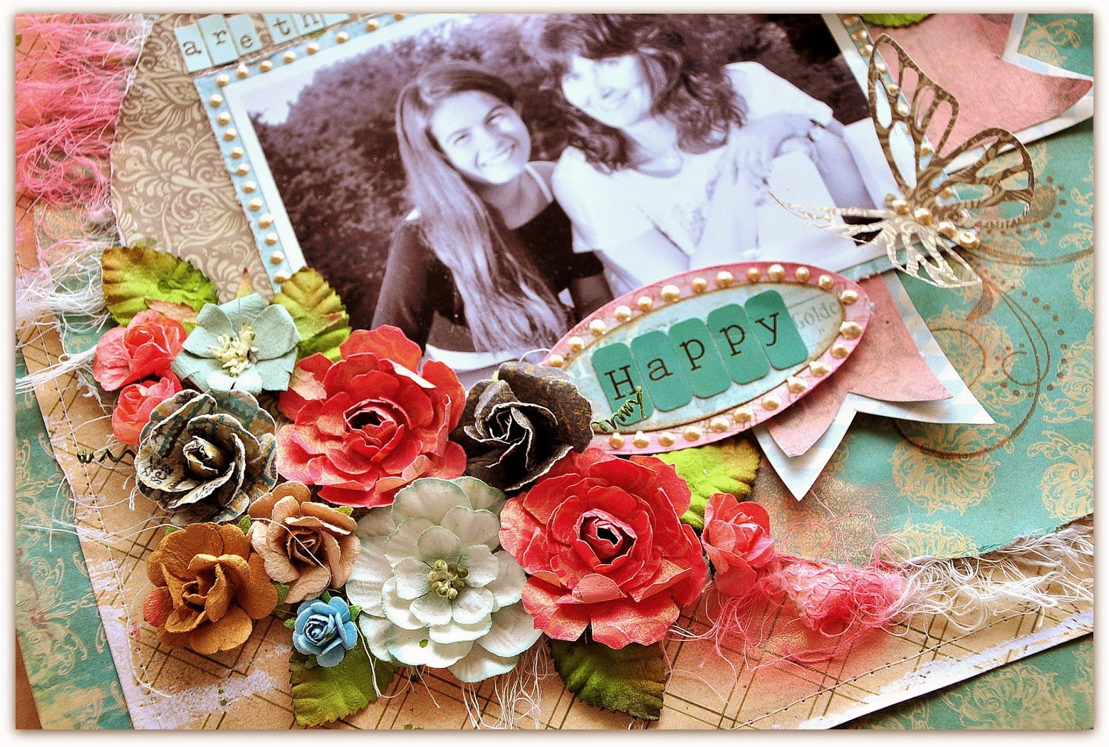 There is a lot of layering of different elements on this page and also lots of flowers. Since I received the Sizzix Bigz die 'Tattered Florals' I cannot stop using it to make flowers for my cards and pages.