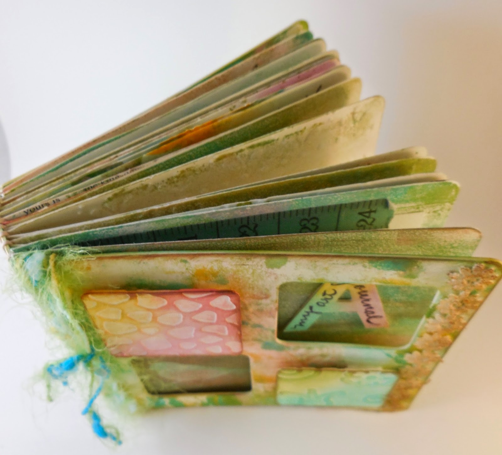 For this project, I cut two windows in the Album cover and then embossed the die cut squares with the Animal Print folder. I used the Gelli plate and my new ColorBox Blends inks from Clearsnap to ink the cover and pages of the mini-album Art Journal.