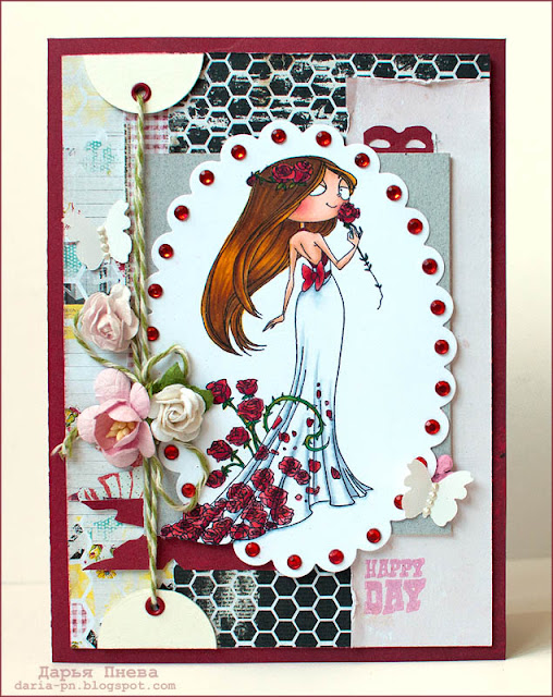 I love to color stamps, and then make cards with the resulting images. And I love when there are laced or scalloped edge around the picture. But sometimes, the picture does not fit in the selected die. And in the picture below I show what Ido when I don’t want to cut anything from the picture.