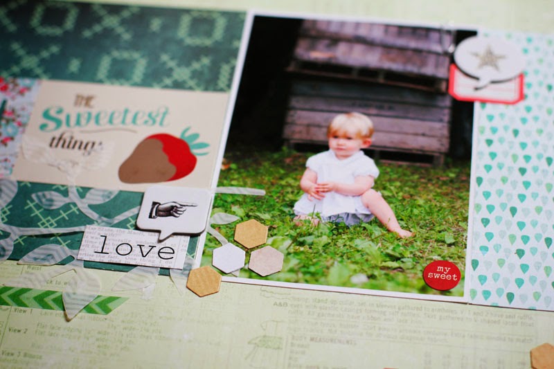 It is a pretty card with hexagons patterns. I use the small patterns as embellishments! My page is scattered with little kraft die cuts that are glued with liquid glue.