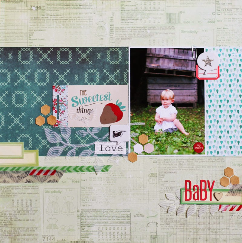 Start by gluing your picture. Build your page in a horizontal lay-out with pattern paper scraps.