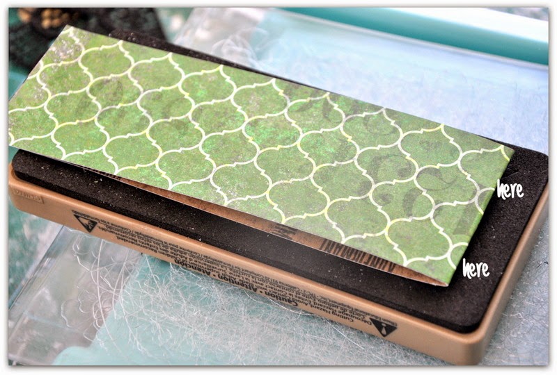 Jag använde en frameworks die för 'lattice' mönstret. Som du ser så har mönstret blivit längre än själva die'en och där är ingen skarv. Detta beror på att jag placerade ett dubbelvikt papper på min die så att den inte skar riktigt ända ut på motivet. Man sparar ett par millimeter som gör att motivet hänger ihop. Titta på bilderna där det står 'here'.