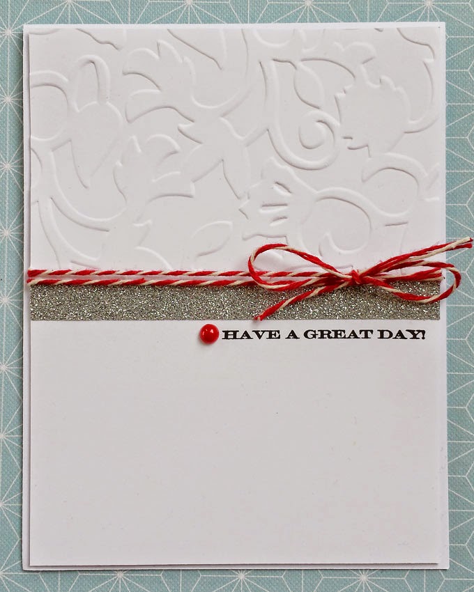 Det næste skridt var naturligvis at få et kort ud af det embossede karton og fortsat holde det enkelt: Jeg tilføjede glitter tape, baker's twine, en tekst og en enkelt halvperle, før jeg monterede det hele på kortbasen vha. 3d-puder.