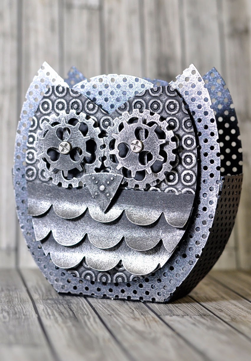 Here is a gift box made using the Bigz XL owl bag. It's a really lovely die perfect for party favours and the like and I'm sure you will be seeing it in many magazine projects and in many different colour combinations and materials.