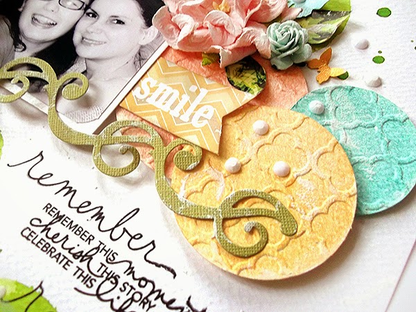 Circles are my one of the most favourite motifs, these are so versatile and useful for any occasion and for every style. For my background I used watercolor paints and stamps, but to create embellies I used Sizzix Framelits Die Set 8pk - Circles2 to cut a few circles in a various sizes and create interesting addition to my page. Each circle was embossed coloured with spray paints and embossed using folder with trellis motif.
