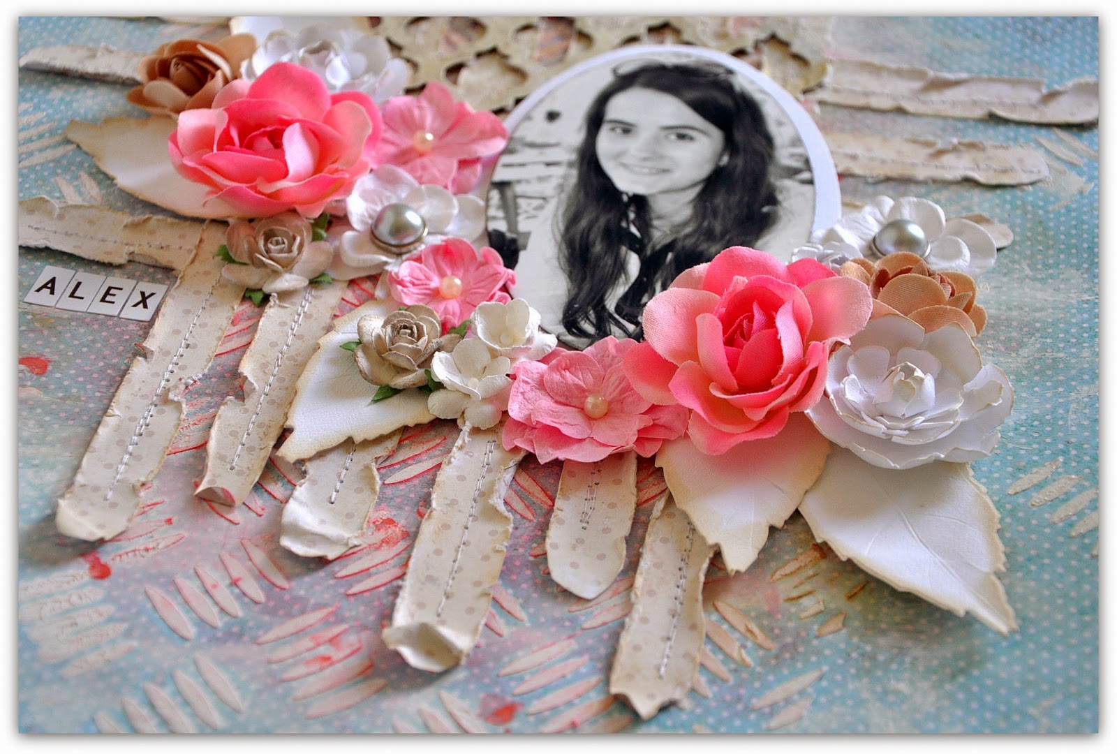 Jag använde en vacker porträttbild på äldsta dottern (kan inte fatta att jag har så vuxna barn,.... :-D ) och några av mina favorit dies från Sizzix.