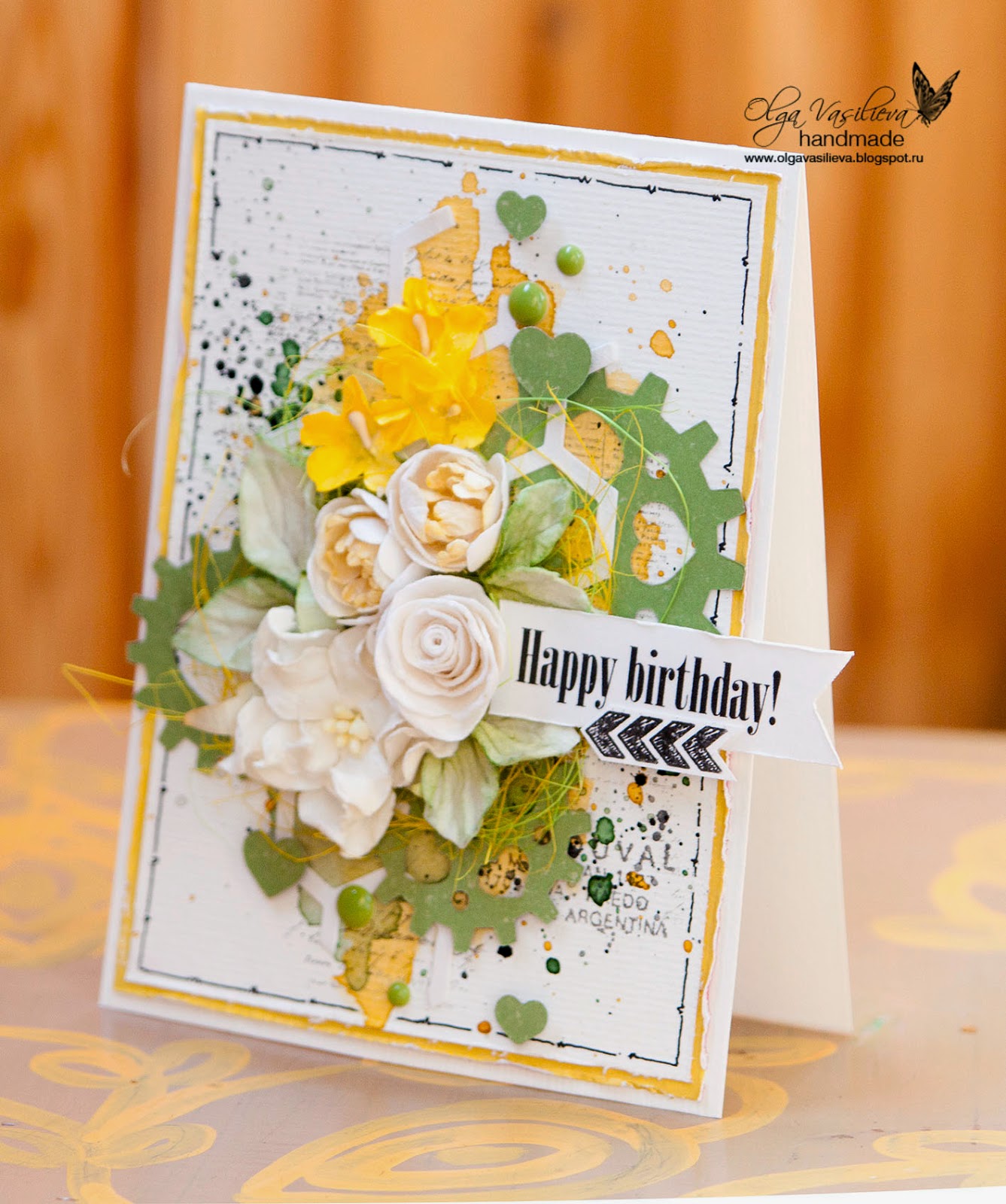 Это моя новая открыточка, в которой я решила к своему стандартному стилю добавить элементы "стимпанка" - это шестеренки с сердечками, которые можно использовать и как отдельные элементы. Роза и пион сделаны с помощью ножей, а сердечки я приклеила на объемный скотч.