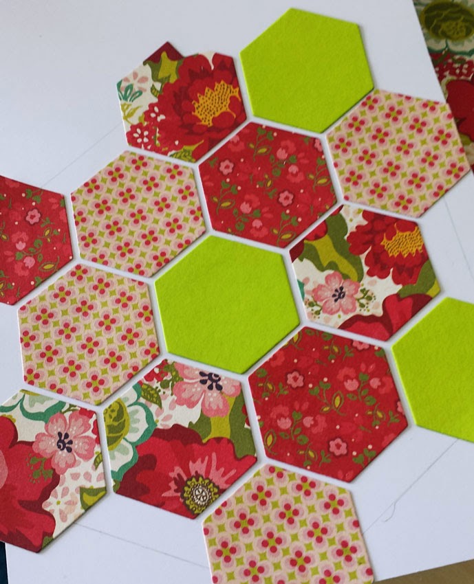 Næste skridt var at lave mit mønstrede papir, og her valgte jeg en mindre sekskant-die, som jeg brugte til at udstanse sekskanter i forskellige mønstrede papirer og i karton. Da jeg havde skåret nogle stykker af hvert papir, brugte jeg en af diene til at tegne en sekskant på et stykke hvidt karton. Det fyldte jeg nu ud med mine små sekskanter, og da jeg havde fyldt hele sekskanten ud, kørte jeg den og dien igennem min Big Shot, hvorefter jeg havde et sekskantet stykke mønstret papir til mit kort.