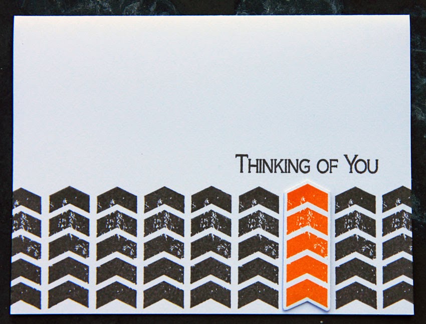 I thought that even though the arrows have a slightly distressed / worn look they would work well for a very simple card design. I simply stamped a row of one of the arrows along the bottom of each card using a dark brown ink.